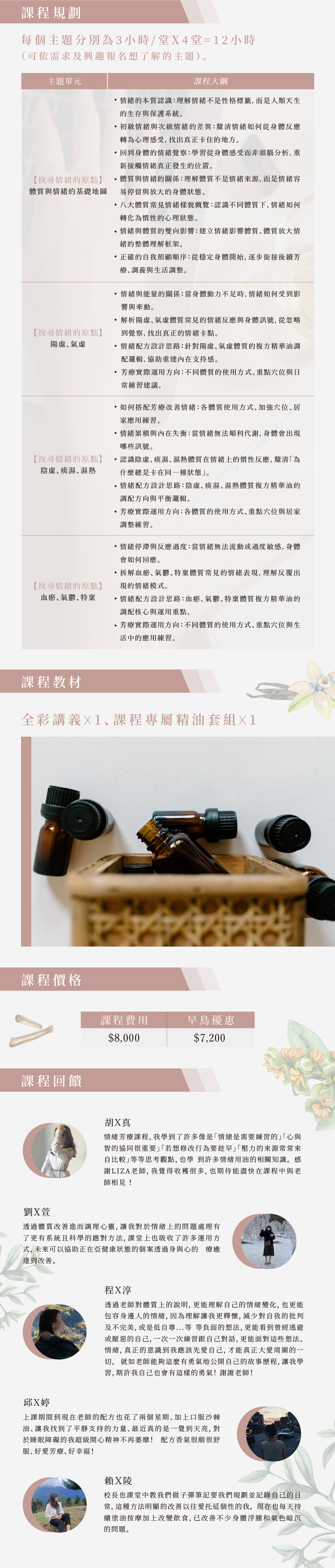 3. 教材相關寄送: 報名截止後會於開課前全班統一寄送教材,讓學員能無差別的收到同一批精油。