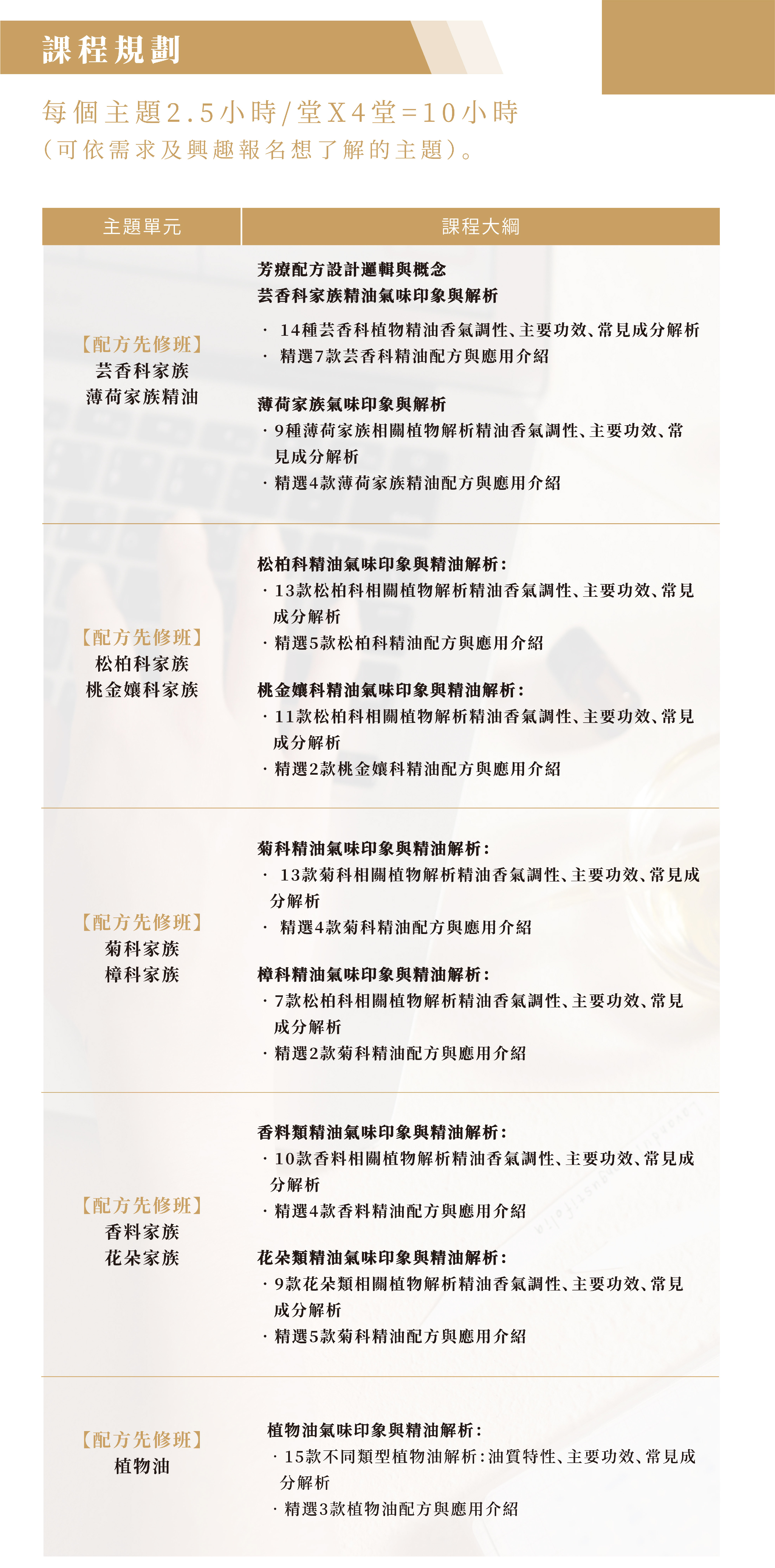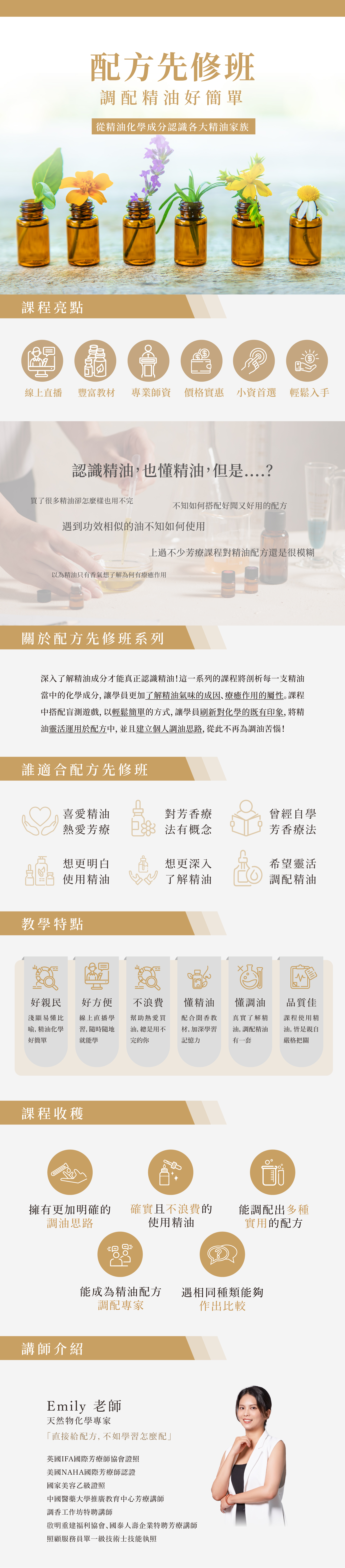 4. 教材相關寄送: 報名截止後會於開課前全班統一寄送教材,讓學員能無差別的收到同一批精油。